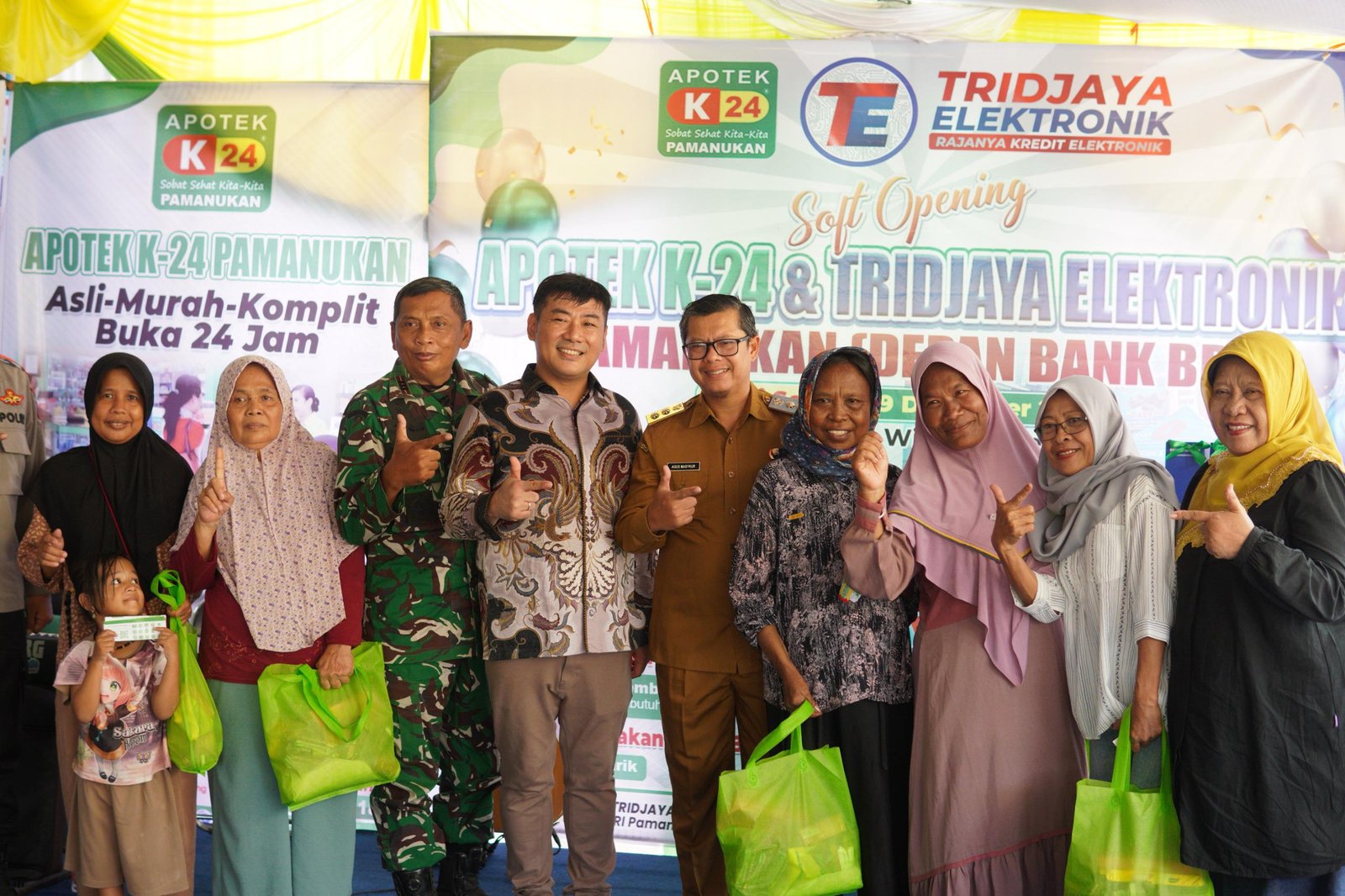 Selain meresmikan unit usaha kesehatan dan elektronik, Tridjaya Group juga menunjukkan kepedulian sosial dengan membagikan 50 paket sembako kepada warga sekitar.