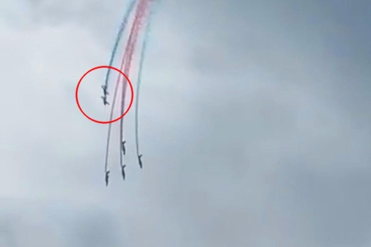 Rekaman video yang beredar di media sosial menunjukkan bahwa ketujuh jet awalnya terbang dalam formasi sambil mengeluarkan asap berwarna. Namun, dua di antaranya bertabrakan di udara.