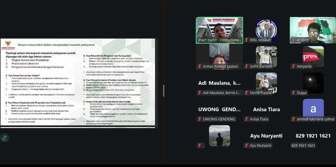 Diskusi ini menghadirkan Asisten Ombudsman RI, M. Ilham Setiawan Bahri, yang memberikan pemaparan komprehensif mengenai peran lembaga tersebut dalam menangani maladministrasi. Ilham menyampaikan bahwa pemuda memiliki peran vital sebagai mitra strategis Ombudsman di lapangan.