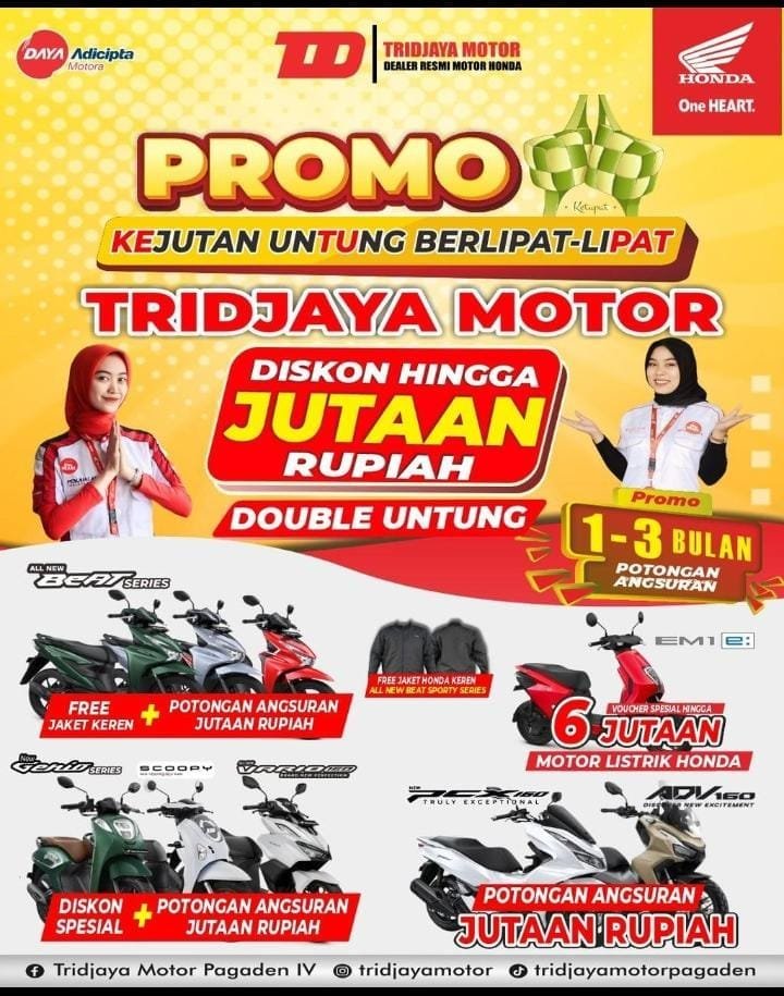 Promo unggulan berupa DP 0% tanpa biaya admin untuk semua produk Tridjaya elektronik dan diskon jutaan untuk motor menjadi magnet utama. Tak hanya itu, sepeda listrik dengan uang muka ringan menjadi daya tarik tersendiri di tengah tren kendaraan ramah lingkungan.