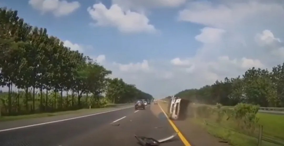Sebelumnnya di KM 129.400 masih di jalur yang sama arah ke Timur atau Palimanan, kecelakaan terekam kamera kendaraan atau dashcam dari mobil pengendara yang persis berada di belakangnya.
