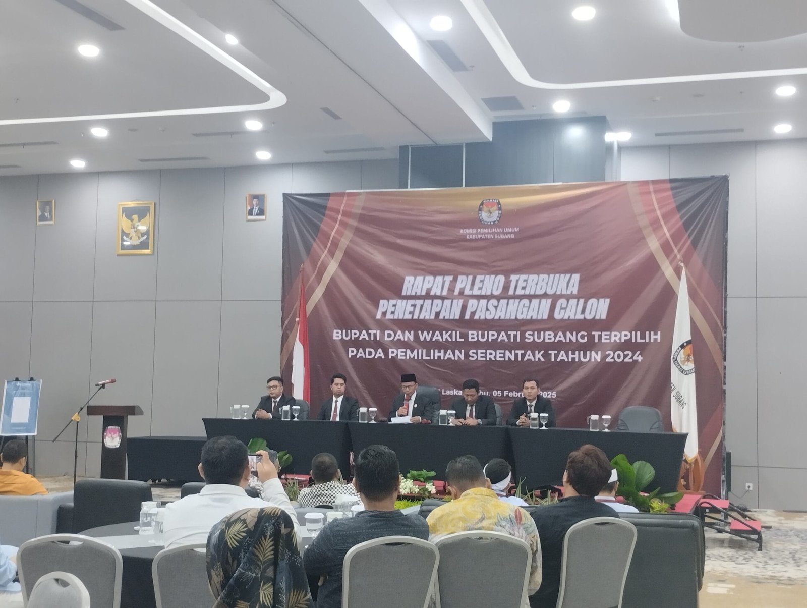 Keduanya ditetapkan KPU Subang sebagai Bupati-Wakil Bupati Subang Terpilih dalam Rapat Pleno Terbuka yang digelar pada Rabu (05/02/25) malam di Hotel Laska Subang. Ketua KPU Subang, Abdul Muhyi, memimpin langsung rapat pleno tersebut.