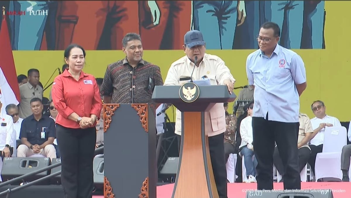 Ia juga terlihat didampingi oleh Wakil Ketua DPR RI, Sufmi Dasco Ahmad, serta Sekretaris Kabinet Letkol (Purn) Teddy Indra Wijaya. Selain itu, pada acara May Day tersebut, Raffi Ahmad bertindak sebagai pembawa acara, sementara utusan khusus presiden untuk pemuda dan kreativitas turut mengumumkan kehadiran Prabowo Subianto.
