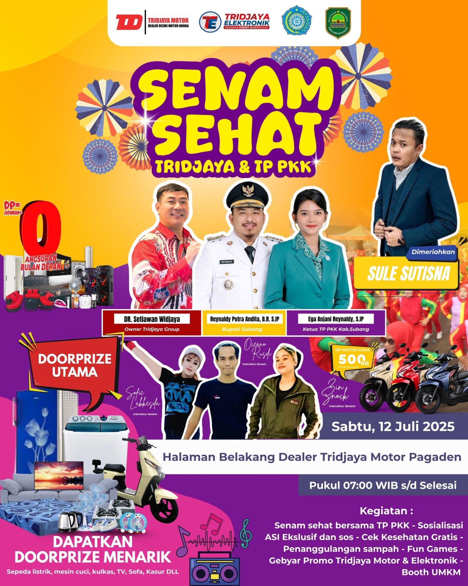 Subang – Dalam rangka menggalakkan gaya hidup sehat sekaligus mempererat hubungan dengan masyarakat, Tridjaya Motor bersama TP PKK Kabupaten Subang akan menggelar Senam Sehat Tridjaya & TP PKK pada Sabtu, (12/07/2025).