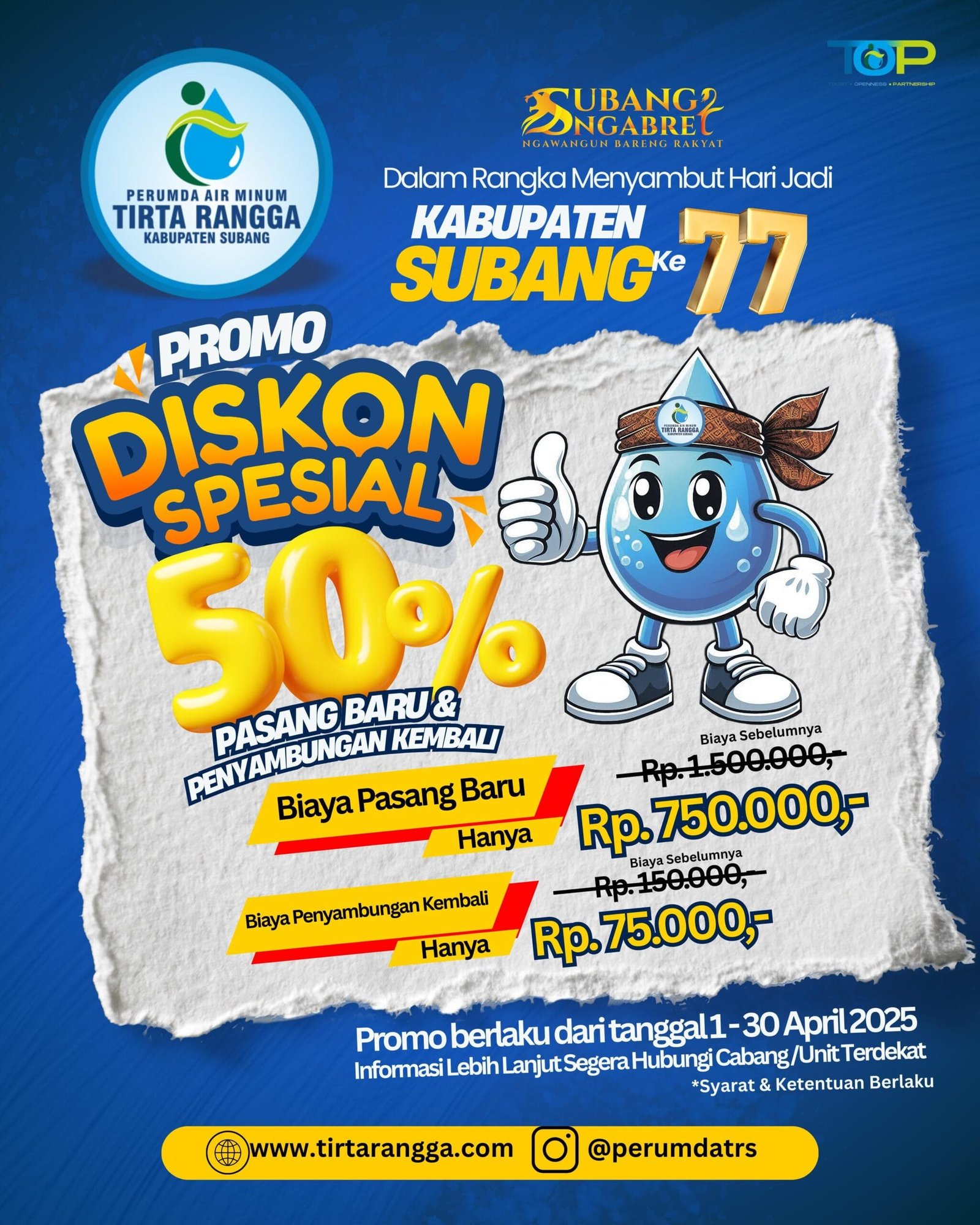 Subang – Jelang peringatan Hari Jadi Kabupaten Subang ke-77, Perumda Tirta Rangga Subang menggelar program diskon hingga 50 persen untuk pemasangan sambungan baru serta penyambungan kembali layanan air bersih.