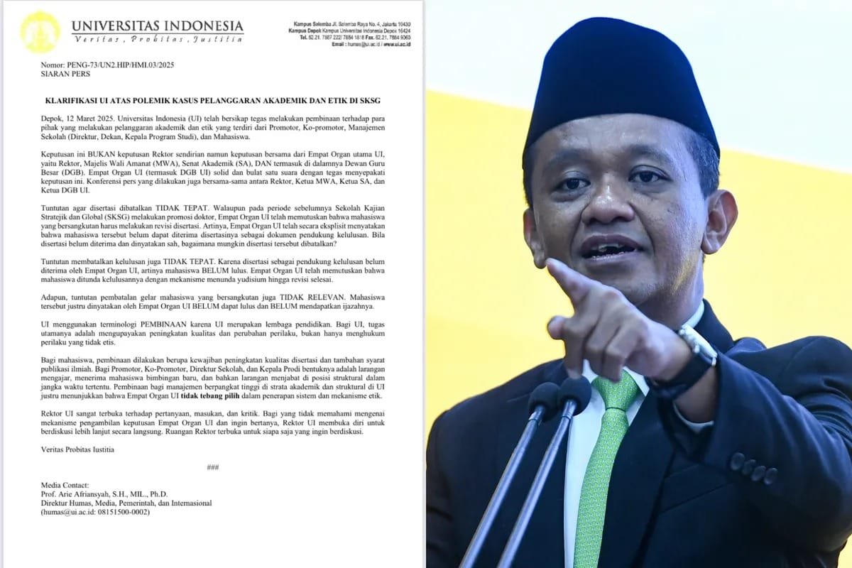 Mengutip dari Pikiran Rakyat, menanggapi polemik ini, Universitas Indonesia memberikan klarifikasi bahwa keputusan terkait disertasi Bahlil bukan hanya oleh Rektor secara pribadi, tetapi oleh empat organ utama UI, yakni Rektor, Majelis Wali Amanat (MWA), Senat Akademik (SA), dan Dewan Guru Besar (DGB) UI.