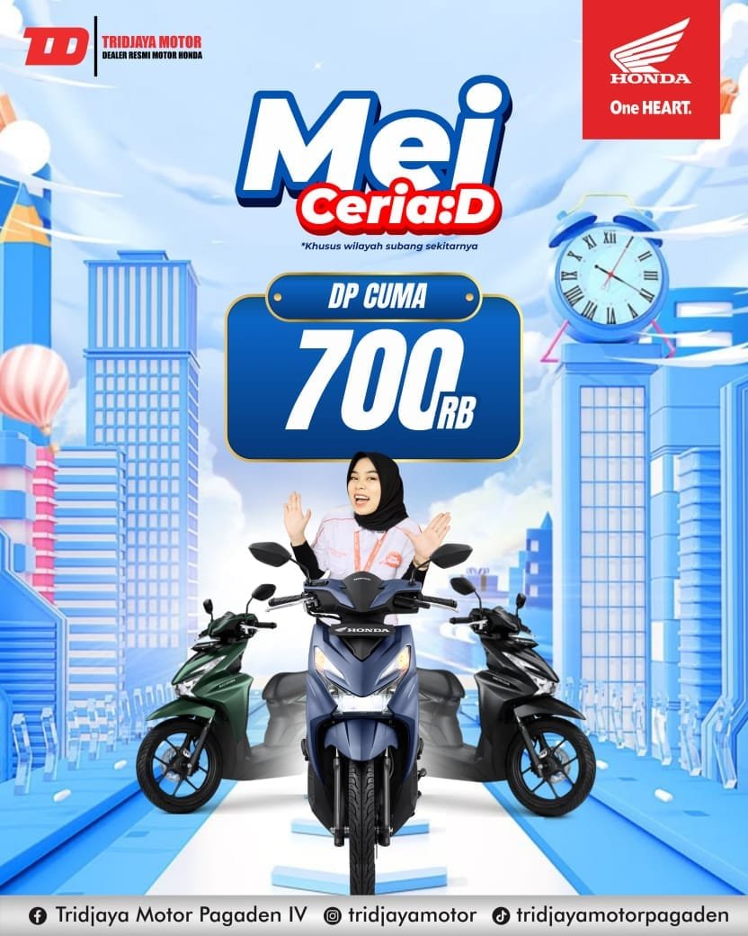 SUBANG – Tridjaya Motor Pagaden menghadirkan promo spesial “Mei Ceria” dengan penawaran menarik, cukup dengan DP mulai 700 ribuan, Anda sudah bisa membawa pulang motor impian!
