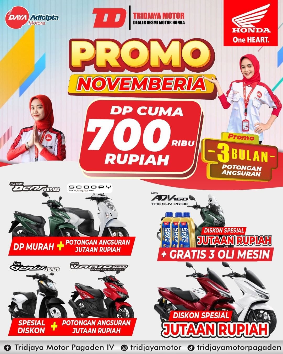Bagi masyarakat yang telah merencanakan pembelian kendaraan roda dua, bulan November ini adalah momen yang paling tepat. Promo ini berlaku di seluruh cabang dealer Tridjaya Motor.