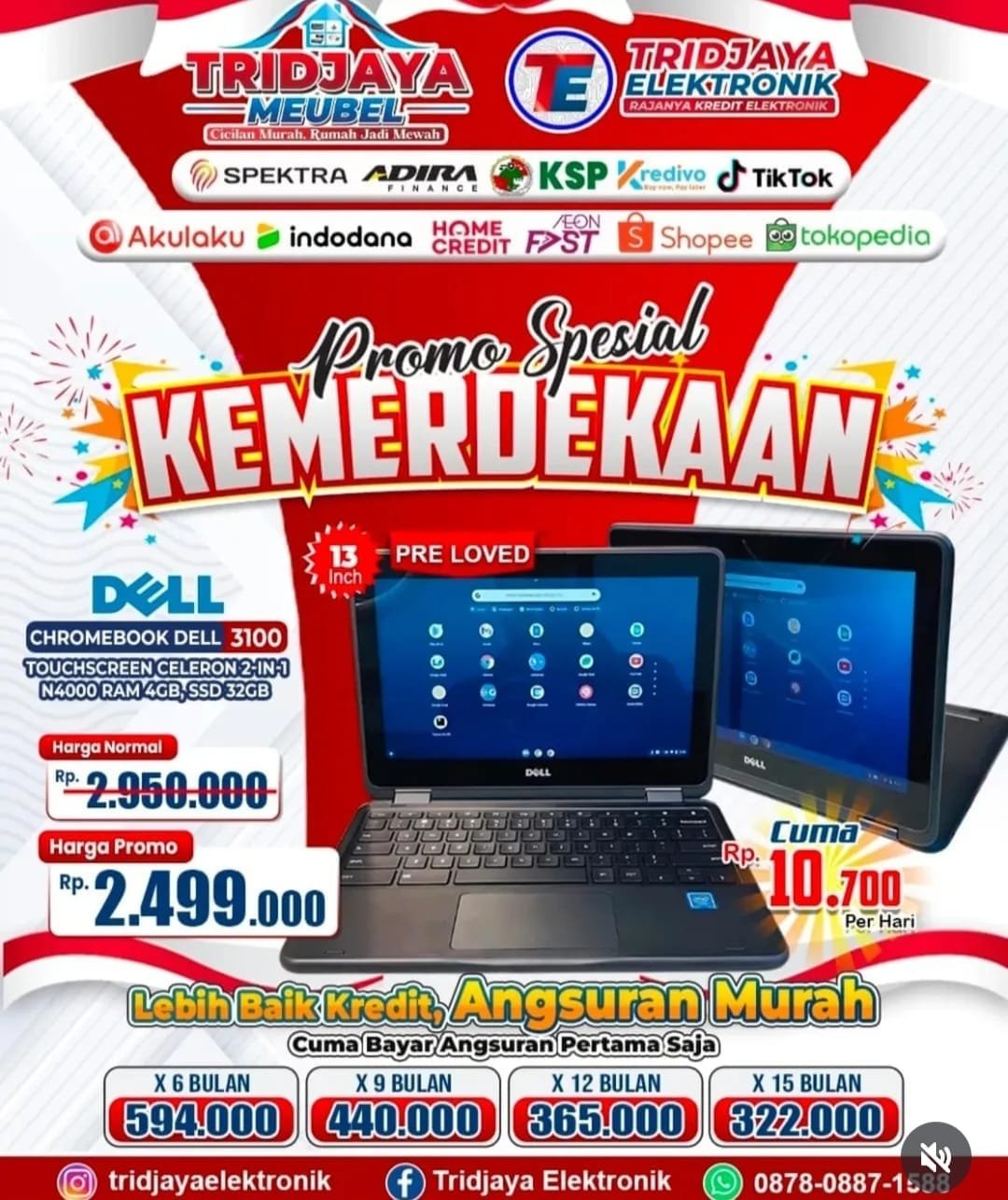 Promo ini berlaku terbatas, hanya dengan membayar angsuran pertama, pelanggan sudah bisa langsung membawa pulang laptop idaman. Informasi lebih lanjut dapat diperoleh melalui akun resmi @trijayaelektronik atau menghubungi nomor WhatsApp yang tertera.(adv/clue)