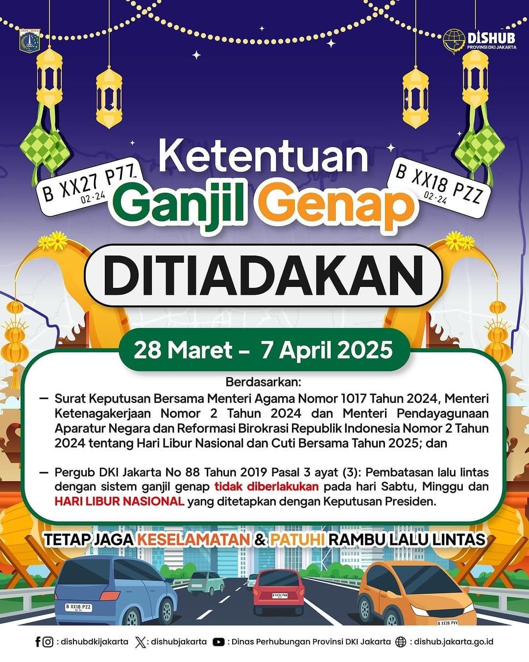 “Sehubungan dengan Libur dan Cuti Bersama Hari Suci Nyepi TahubBaru Saka 1977 dan Hari Raya Idul Fitri 1446 Hijriah pada 28 Maret 2025-7 April 2025, ketentuan Ganjil Genap di Jakarta DITIADAKAN,” cuit Dishub DKI Jakarta dalam pengumuman resminya di instagram @dishubdkijakarta.