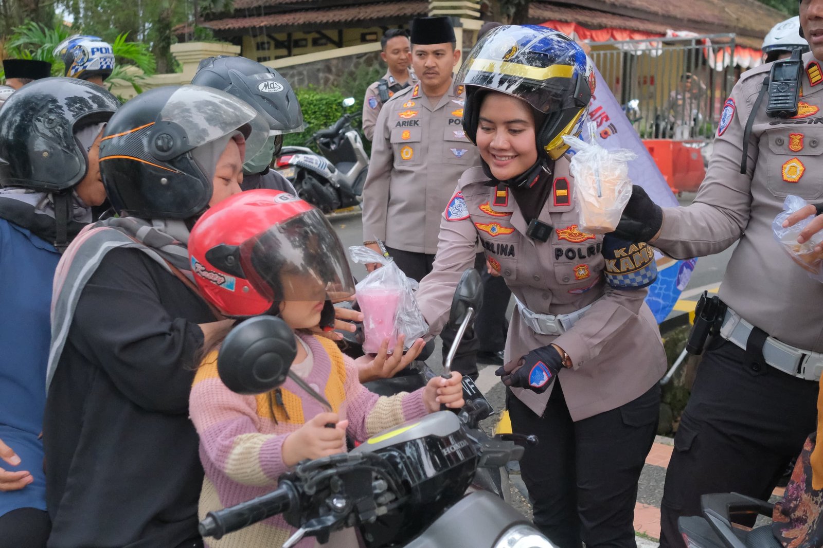 Satlantas Polres Subang bagikan takjil sembari kampanyekan keselamatan berkendara. Foto: Satlantas Polres Subang
