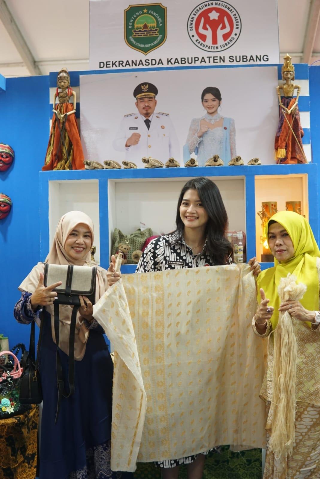Ega Anjani berkunjung langsung ke stand Dekranasda Kabupaten Subang. Dalam pameran tersebut, ditampilkan sejumlah produk kerajinan unggulan. Termasuk kain songket sieup berbahan baku serat daun nanas yang menjadi ciri khas Kabupaten Subang.