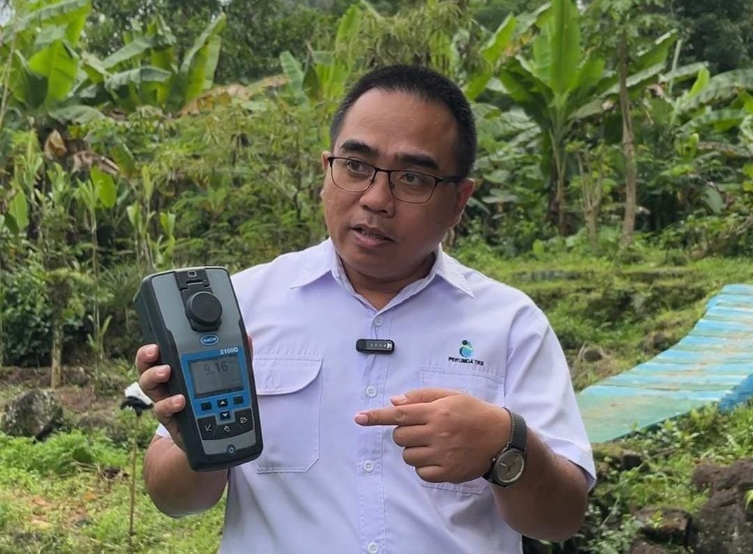 Tim operator Perumda Tirta Rangga Subang melakukan pengecekan langsung di lokasi untuk memverifikasi kondisi air. Hasil pengukuran menggunakan turbidity meter menunjukkan bahwa tingkat kekeruhan (turbidity) air berada di angka 9,16 NTU.