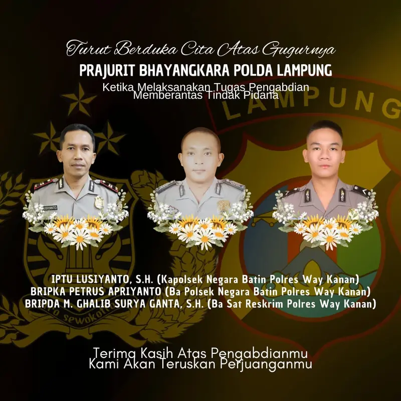 Ketiga polisi yang tewas adalah Inspektur Satu (Iptu) Lusiyanto, yang menjabat sebagai Kapolsek Negara Batin, Brigadir Kepala (Bripka) Petrus Apriyanto, dan Brigadir Dua (Bripda) Ghalib Surya Ganta. Jenazah mereka telah berada di RS Bhayangkara Polda Lampung di Bandar Lampung untuk pemeriksaan lebih lanjut.(Clue)