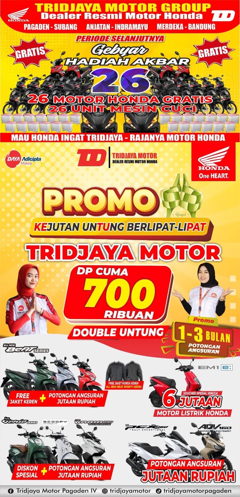 Program promosi ini mencakup berbagai lini produk Honda. Termasuk All New Beat Series yang kini hadir dengan bonus jaket Honda eksklusif serta potongan angsuran jutaan rupiah. Konsumen juga dapat menikmati voucher spesial hingga 6 juta untuk pembelian motor listrik Honda. Hql itu sebagai bagian dari dorongan Tridjaya Motor terhadap kendaraan ramah lingkungan.