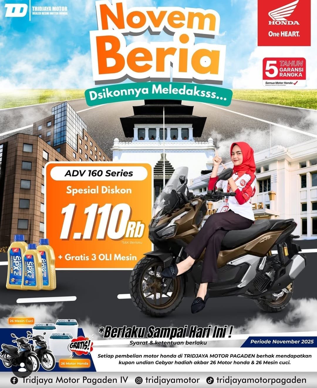 PAGADEN – Dealer resmi motor Honda, Tridjaya Motor Pagaden, menghadirkan promo spesial bertajuk “Novem Beria Diskonnya Meledaksss” untuk konsumen sepanjang November 2025. Melalui program ini, masyarakat berkesempatan mendapatkan spesial diskon Rp1.110.000 untuk pembelian motor Honda ADV 160 Series. Selain potongan harga, konsumen juga akan memperoleh bonus 3 botol oli mesin gratis yang dapat langsung digunakan untuk perawatan kendaraan.
