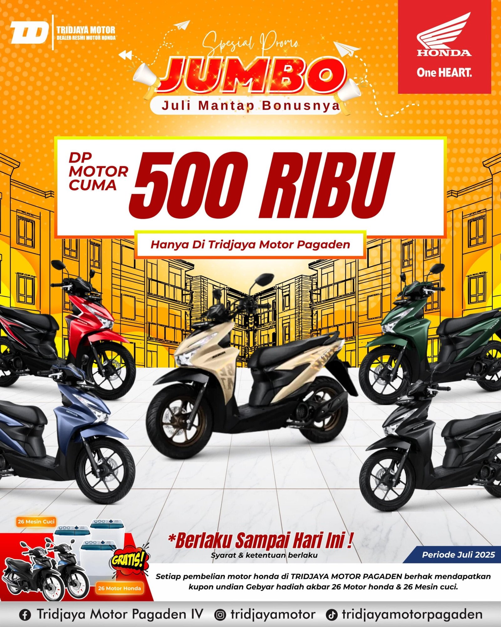 SUBANG — Kabar gembira bagi masyarakat Subang dan sekitarnya! Tridjaya Motor Pagaden menghadirkan promo spesial bertajuk “JUMBO – Juli Mantap Bonusnya” dengan penawaran menggiurkan: DP (uang muka) motor Honda hanya Rp500.000. Promo ini hanya berlaku khusus di dealer resmi Tridjaya Motor Pagaden dan terbatas hingga akhir Juli 2025.
