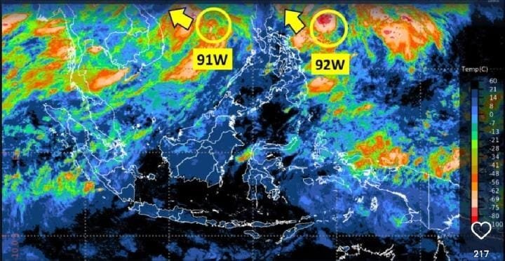 Selain itu, BMKG juga mengidentifikasi potensi bibit siklon baru di Samudra Pasifik Barat, tepatnya di sebelah utara Papua Barat. Perkiraannya, sistem Bibit Siklon 92W ini bergerak ke arah barat hingga barat laut menuju wilayah selatan Kepulauan Filipina.